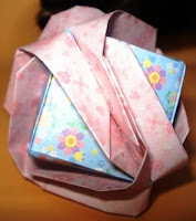 Essa é para Kátia Mitiko. Fiz as três dobraduras para te mostrar as variações, a primeira é o Nikishi - também chamado Brocado japonês, a segunda é o seu querido Bluttenball e o terceiro é um que eu faço porque vi alguma coisa parecida com isso num albúm do Flirck e chamavam de Kusudama de Rosas, mas para mim parece com a Rosa Cubo da Valery Vann.